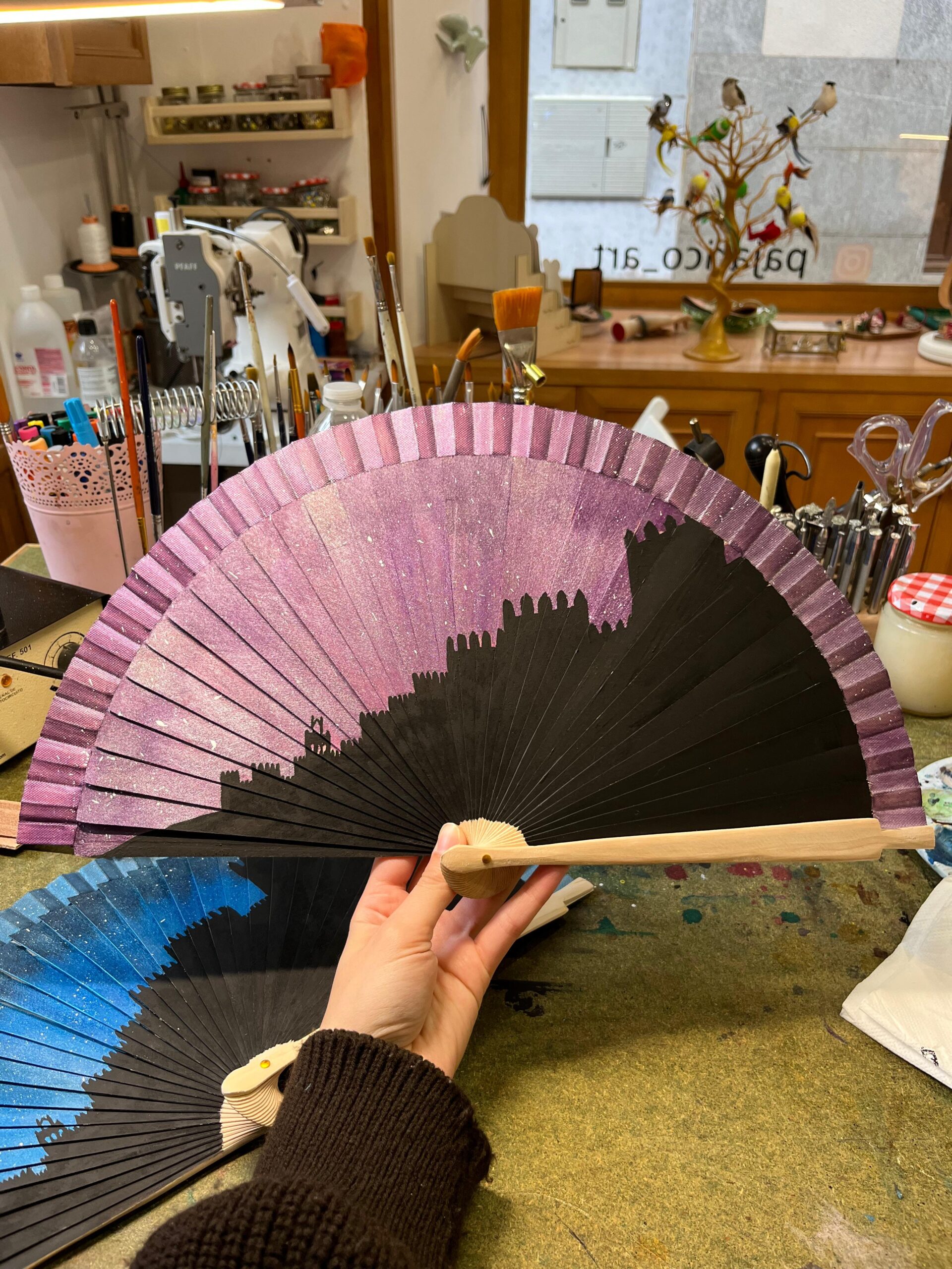 Está realizado sobre madera y tela, utilizando pinturas especiales para textiles, pensadas para ofrecer un acabado duradero y resistente al uso. Cada abanico se pinta de manera individual, por lo que cada pieza es única e irrepetible.