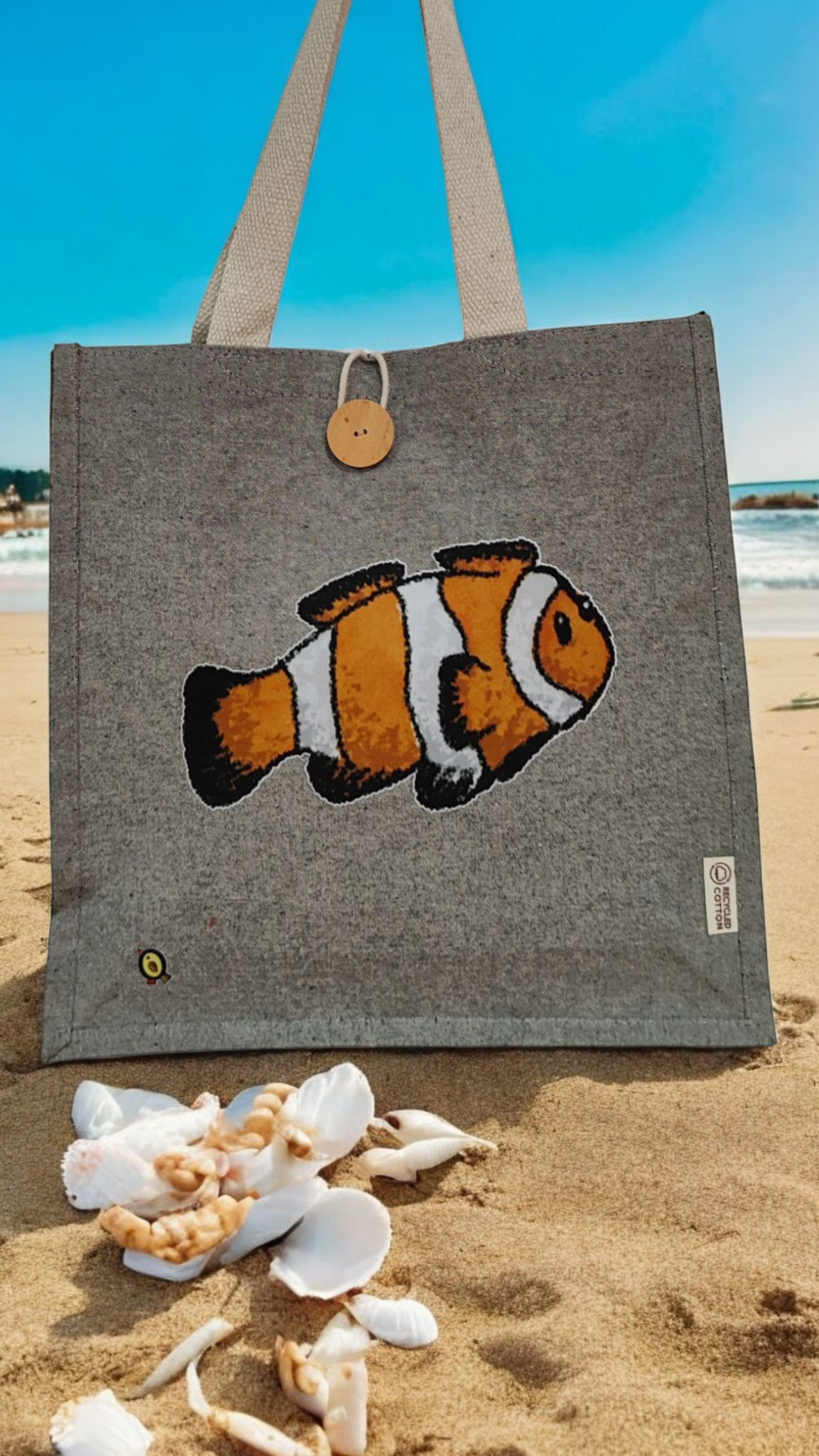 Inspirada en la belleza del océano, esta bolsa tote destaca por su alegre y colorido diseño de pez payaso, símbolo de vida marina y ecosistemas coralinos. Su estilo divertido y consciente la convierte en una compañera ideal para días de playa, compras o escapadas urbanas.