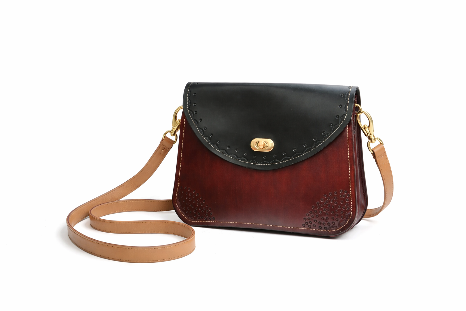La solapa curva en cuero negro, rematada con delicados detalles grabados, aporta carácter y sofisticación al conjunto. El cuerpo del bolso, en tono burdeos, presenta un sutil trabajo decorativo que realza la textura natural de la piel. El cierre metálico dorado añade un toque de luz y elegancia.