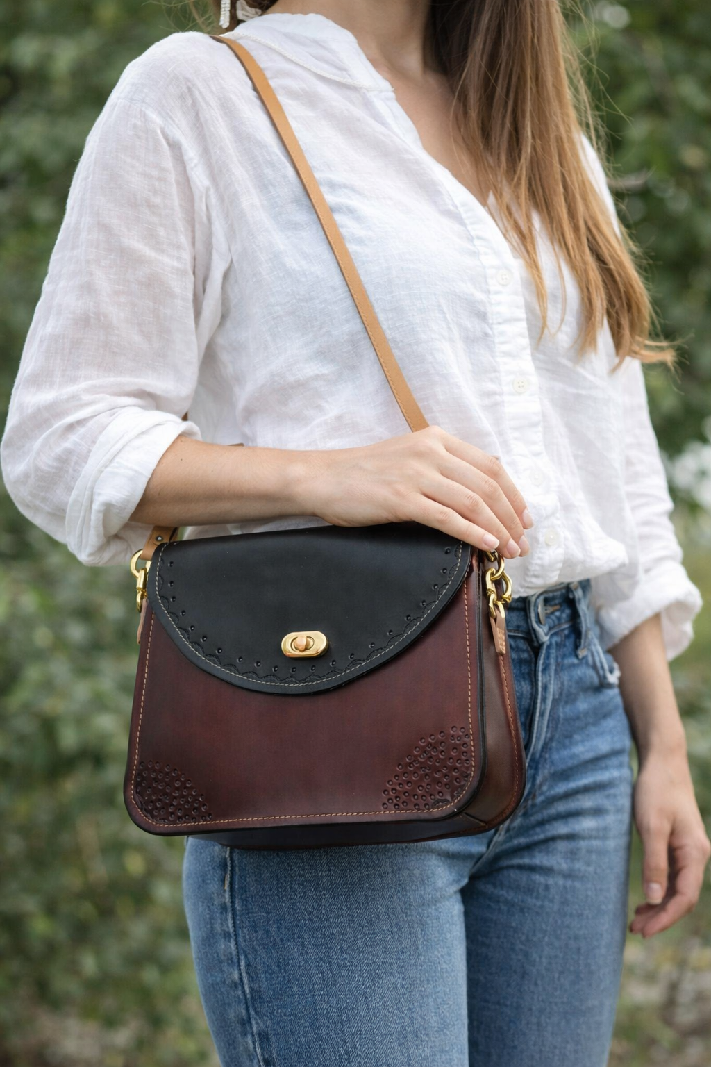 Bolso artesanal de piel, elaborado cuidadosamente a mano, que combina la profundidad del cuero burdeos con la elegancia atemporal del negro. Su diseño equilibrado y femenino lo convierte en una pieza versátil, perfecta tanto para el día a día como para ocasiones especiales.