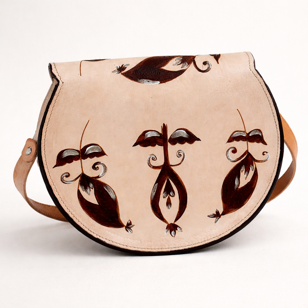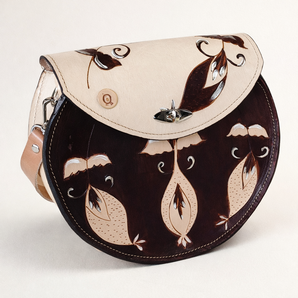 El dibujo está pirograbado y pintado a mano, uno a uno, con un gesto paciente que convierte cada bolso en una pieza única.