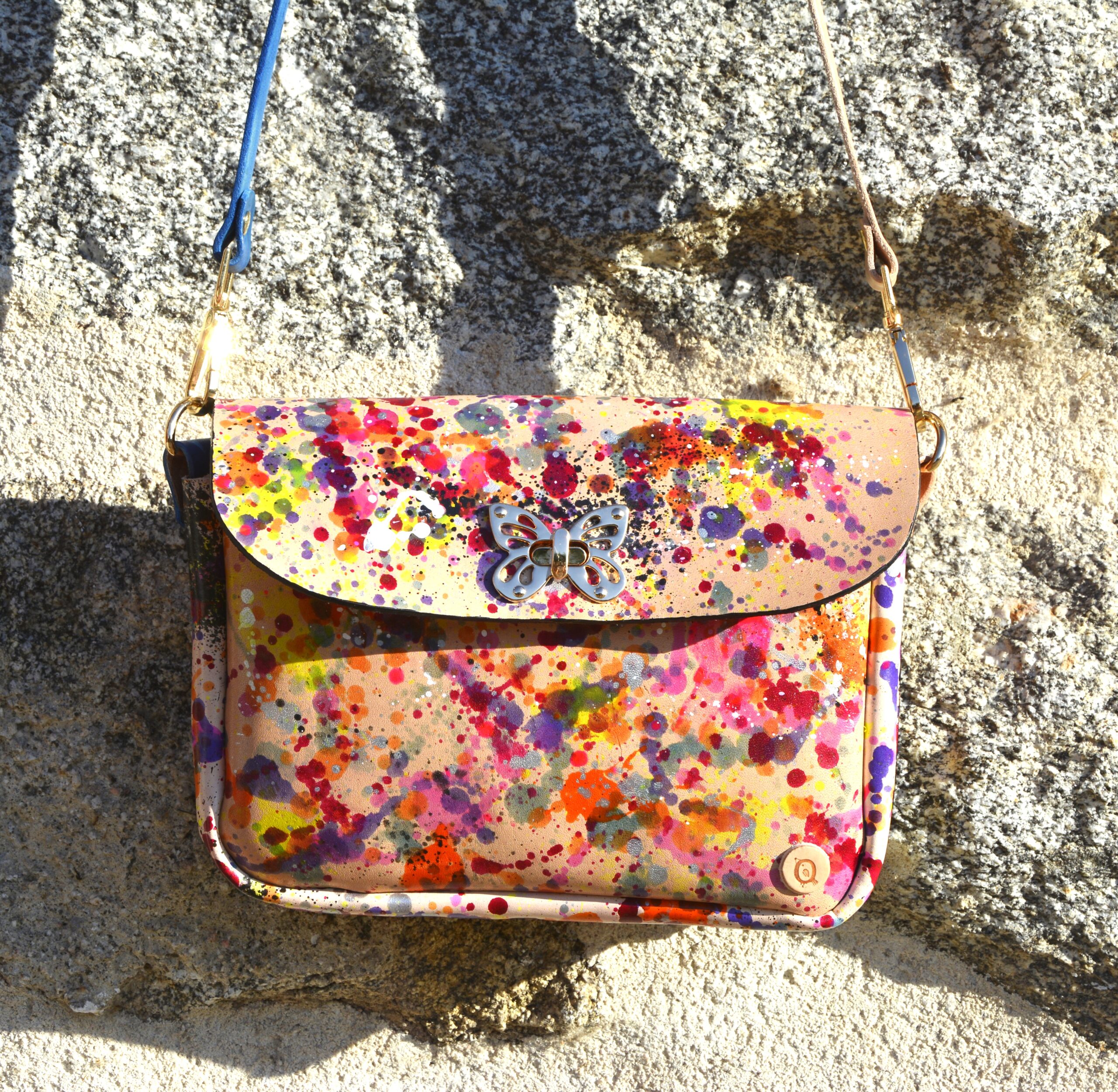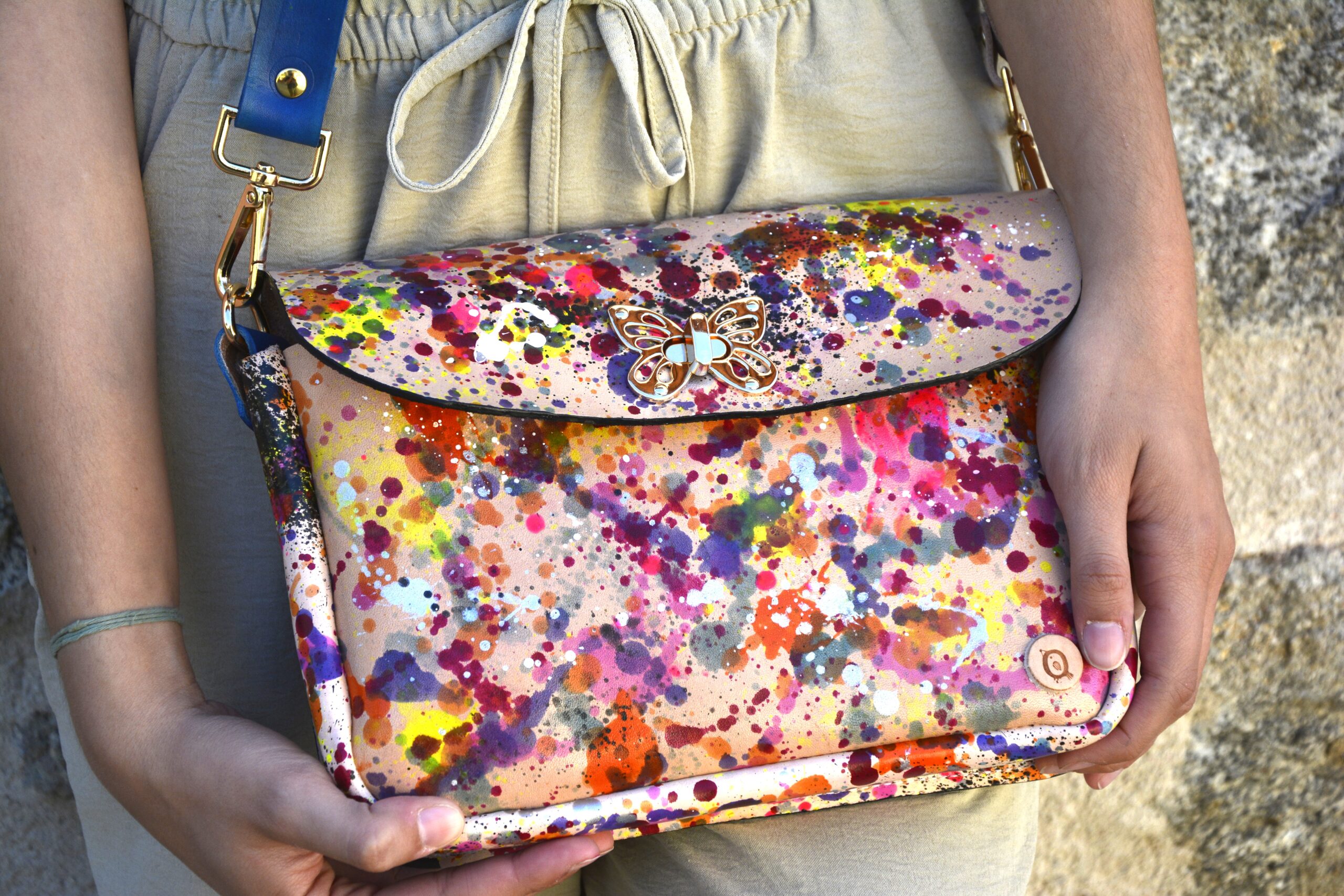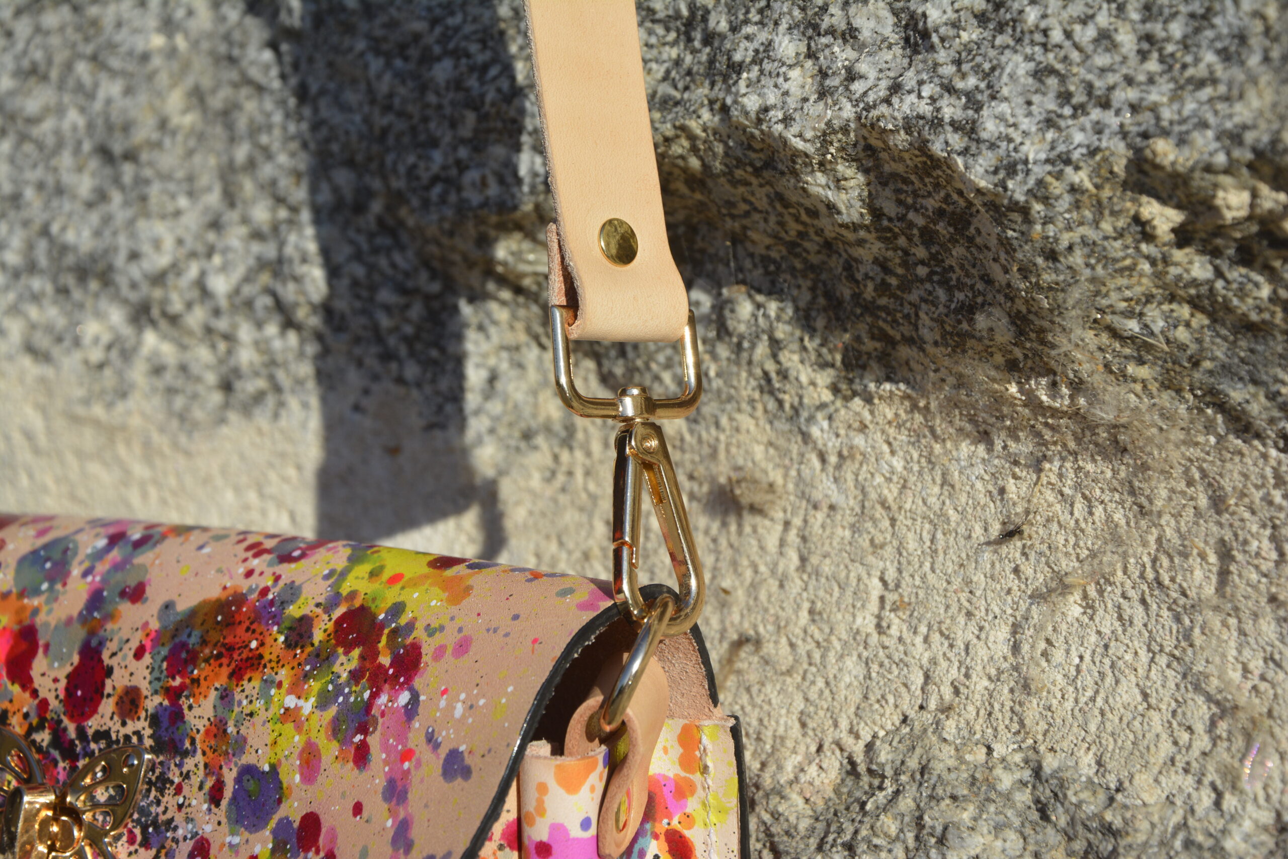 Este diseño único de Pajarico está elaborado en piel natural pintada a mano, con una combinación vibrante de tonos que llenan de vida cualquier look.