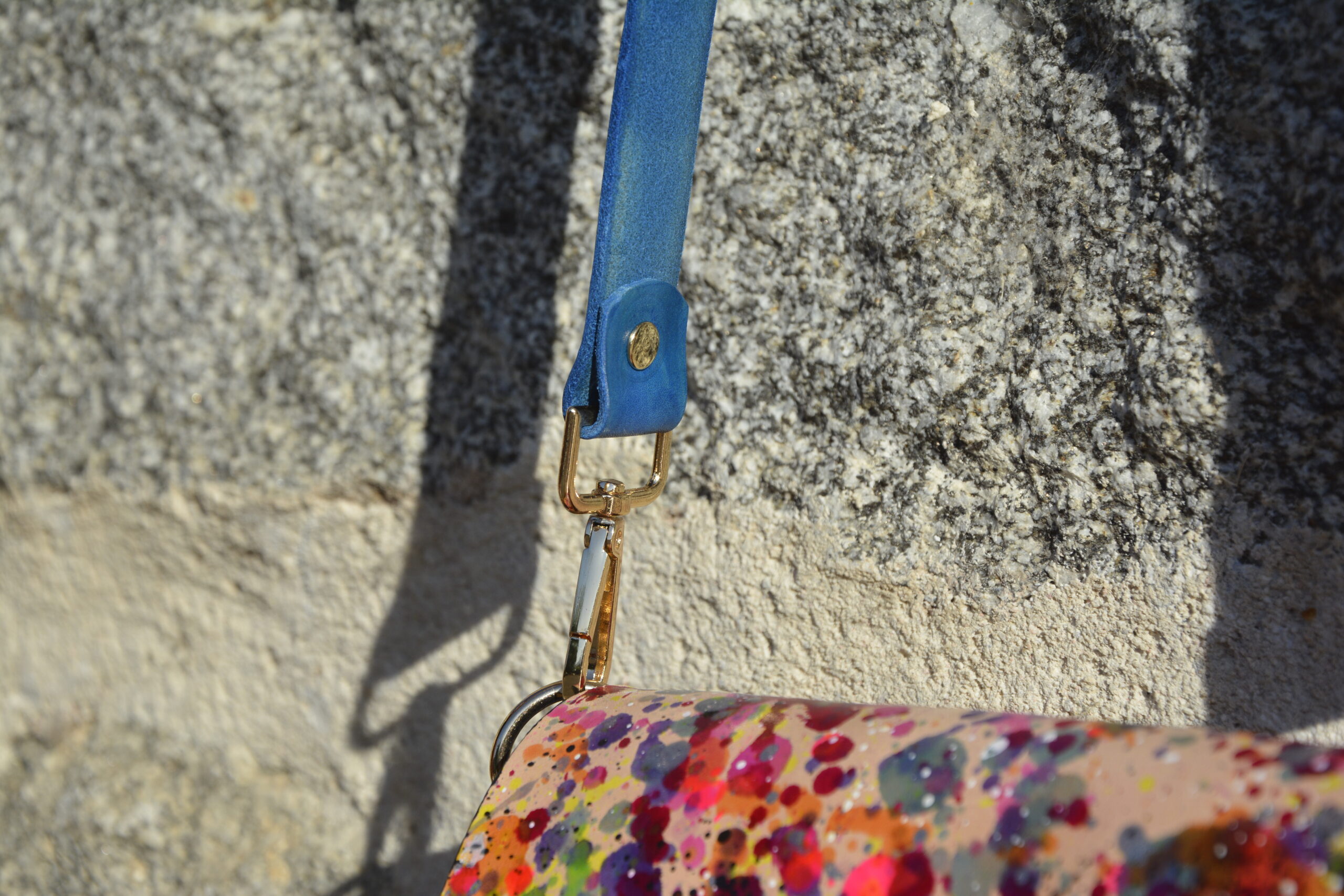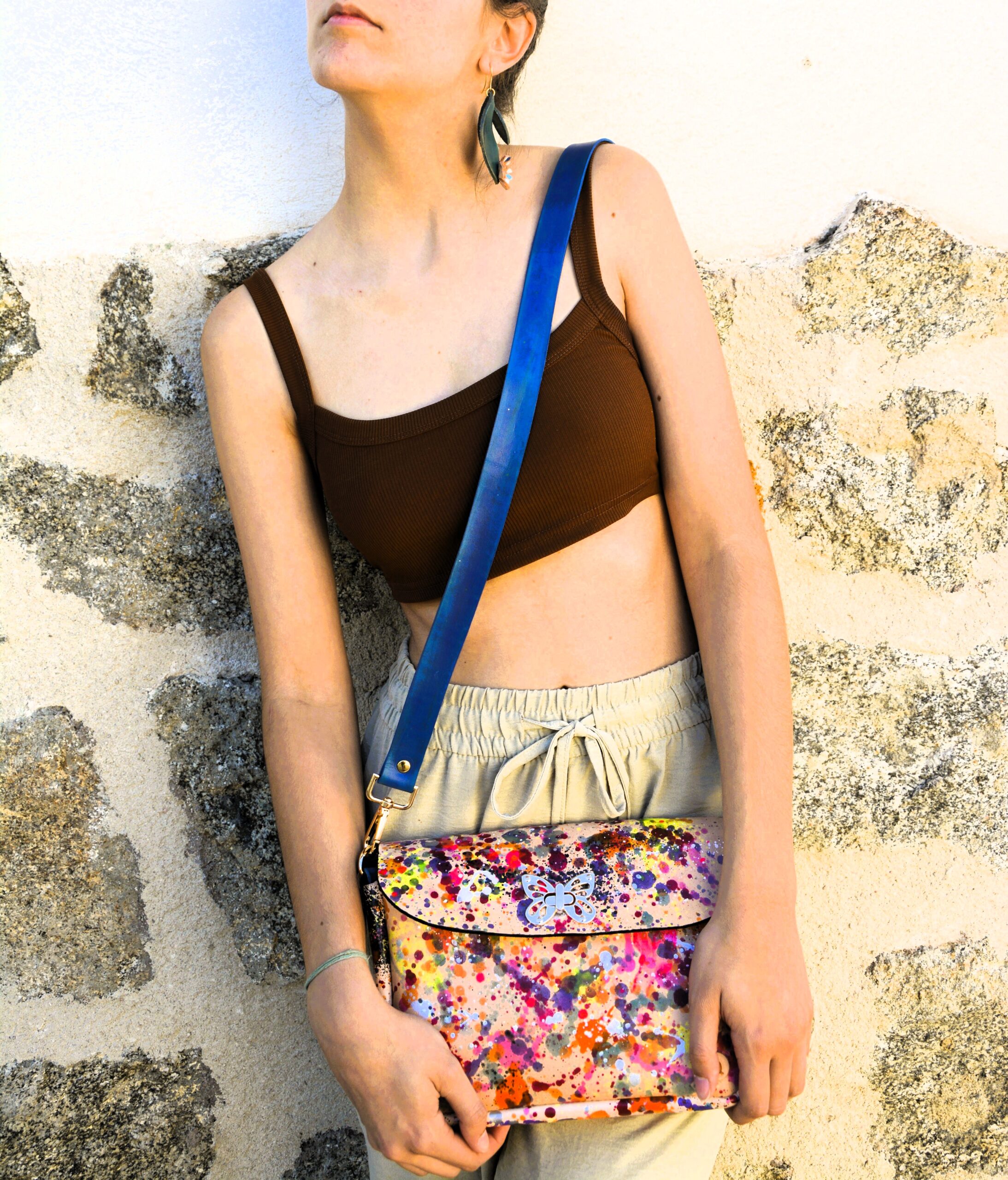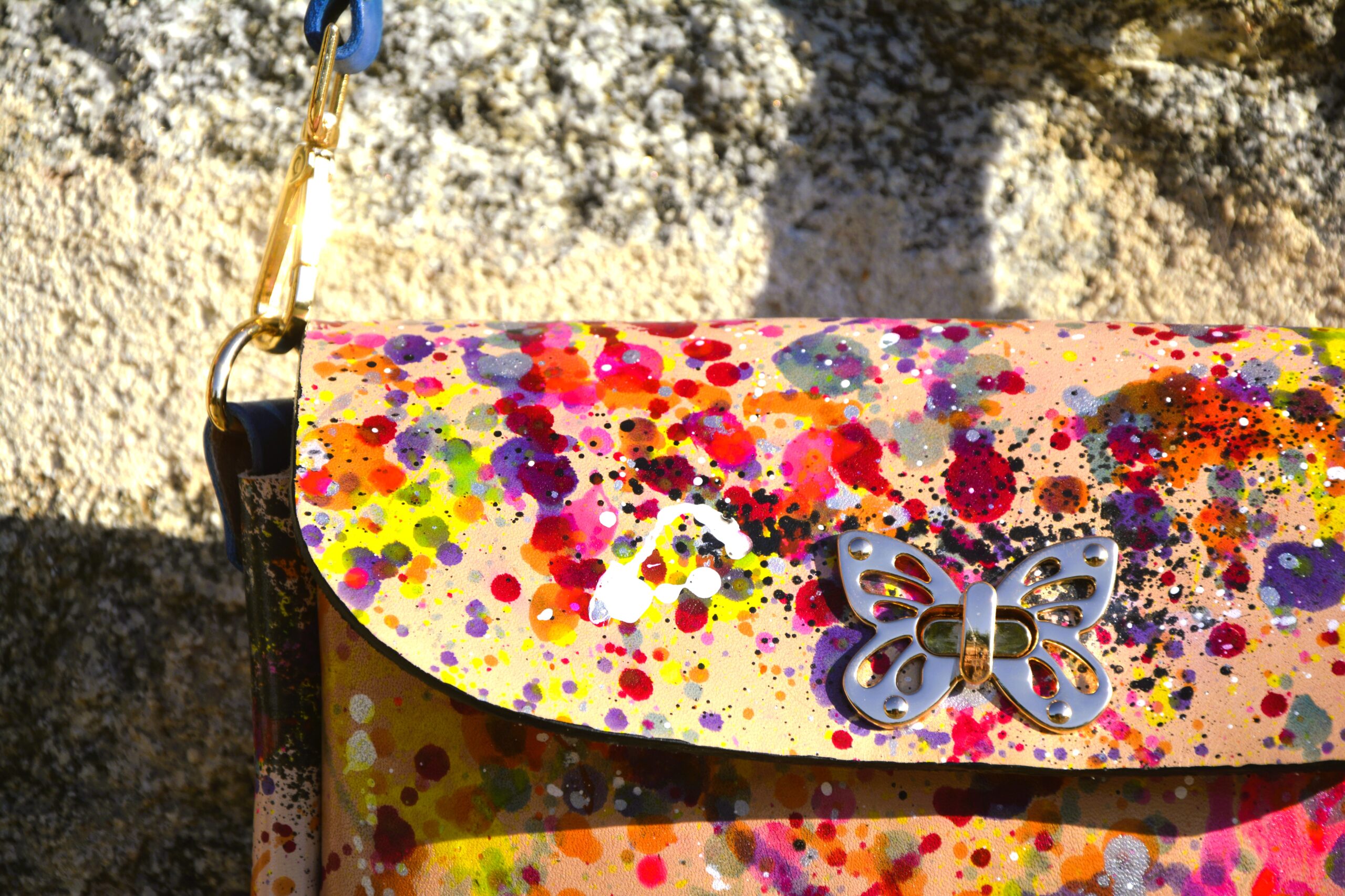Este diseño único de Pajarico está elaborado en piel natural pintada a mano, con una combinación vibrante de tonos que llenan de vida cualquier look.