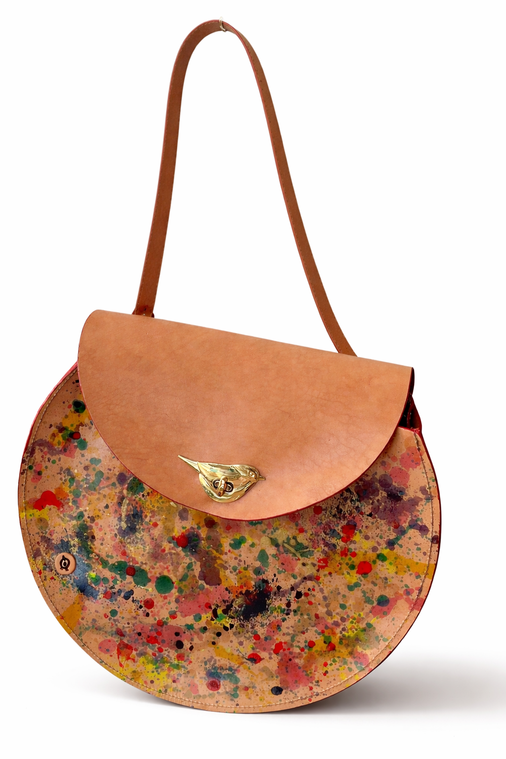 Bolso de cuero Explosión de colores redondo de tamaño grande realizado en cuero de vaca de curtición vegetal, un material natural y resistente que envejece con belleza y carácter. Cada pieza está pintada a mano con pintura especial para cuero, lo que convierte cada bolso en un diseño único e irrepetible.