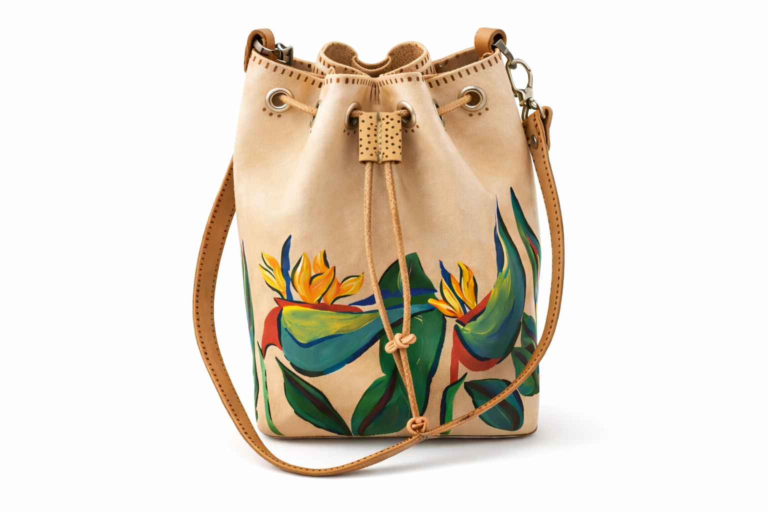 En el Bolso de cuero, el motivo de la Flor del Paraíso está pintado a mano con pintura especial para cuero, llena el bolso de color y personalidad.