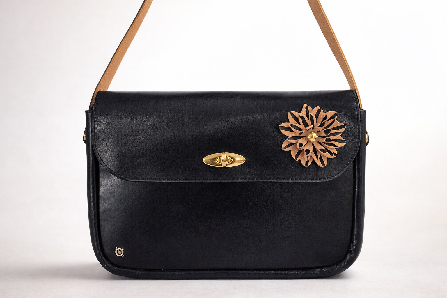 Bolso artesanal realizado en cuero de alta calidad, tintado en negro, con un diseño elegante y atemporal. La pieza se distingue por su flor en tono natural, trabajada a mano, y una pincelada artística en negro, aplicada con pintura especial para cuero, lo que convierte cada bolso en una creación única.