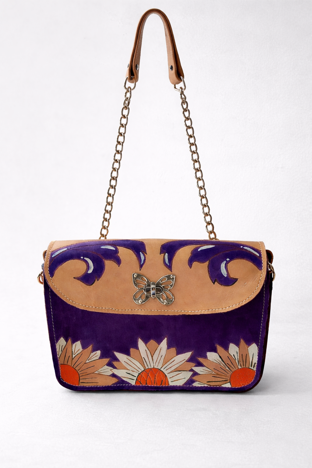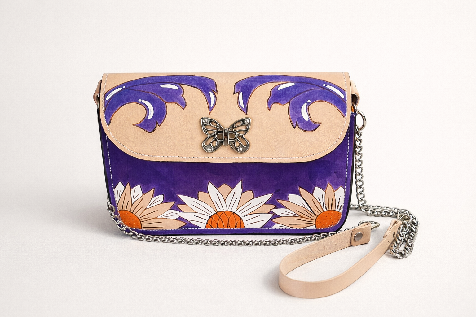 Bolso de cuero pintado a mano con broche mariposa