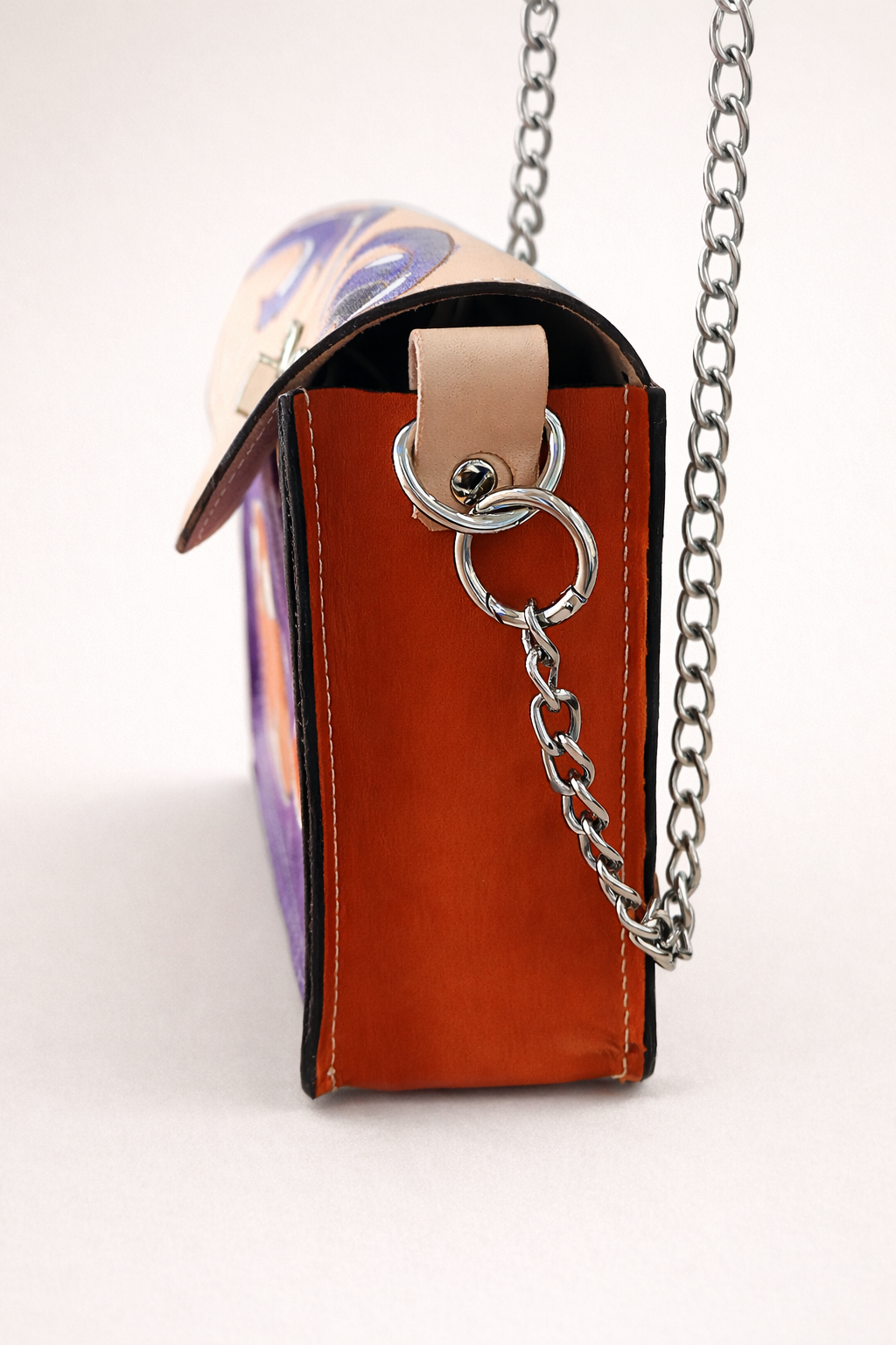 Este bolso es una pequeña obra de arte hecha a mano. Cada detalle, desde el pirograbado hasta la pintura, ha sido trabajado cuidadosamente sobre cuero natural, creando un diseño lleno de carácter y delicadeza. Los tonos violetas combinados con las flores aportan un estilo bohemio y elegante a la vez.