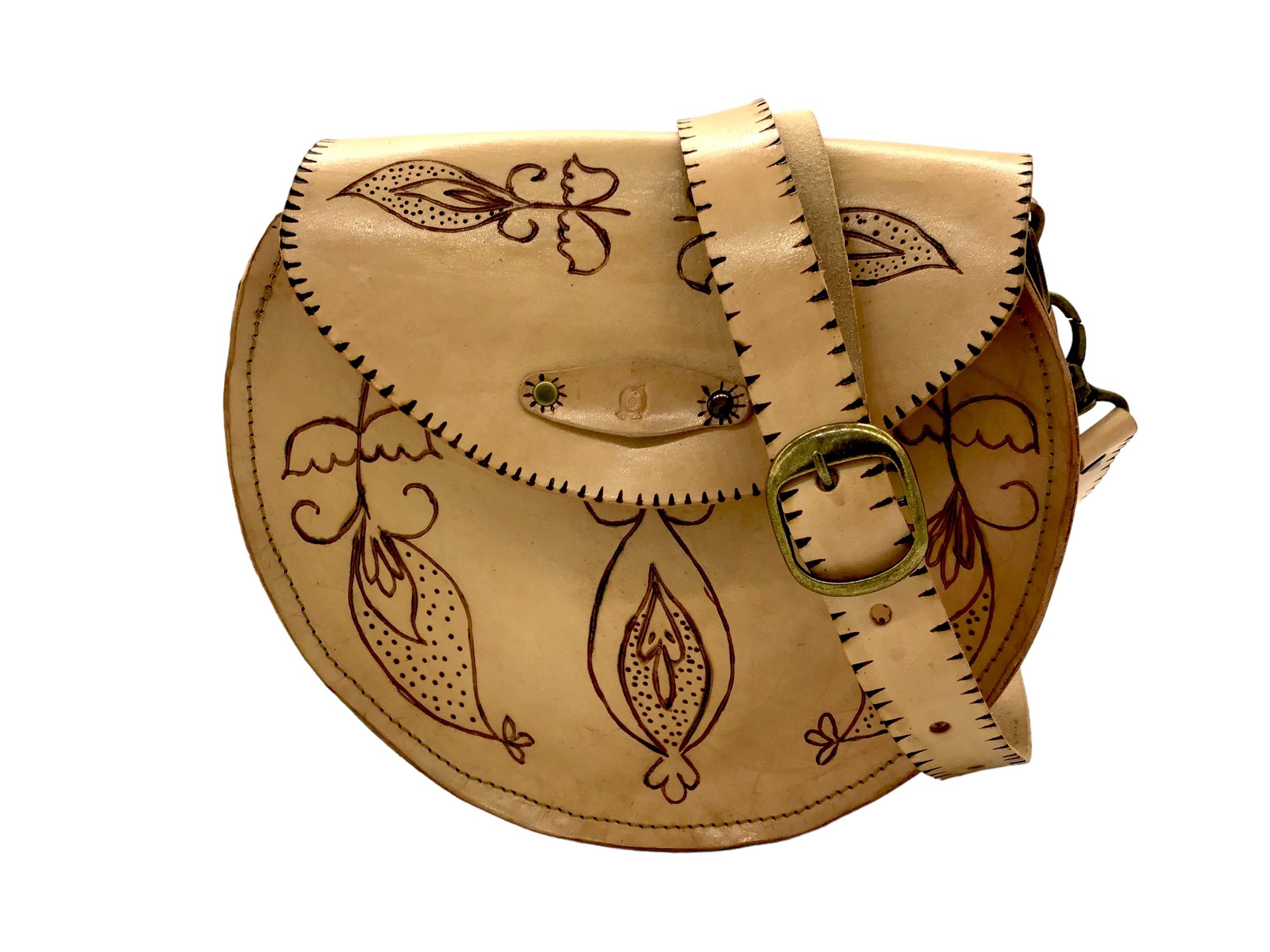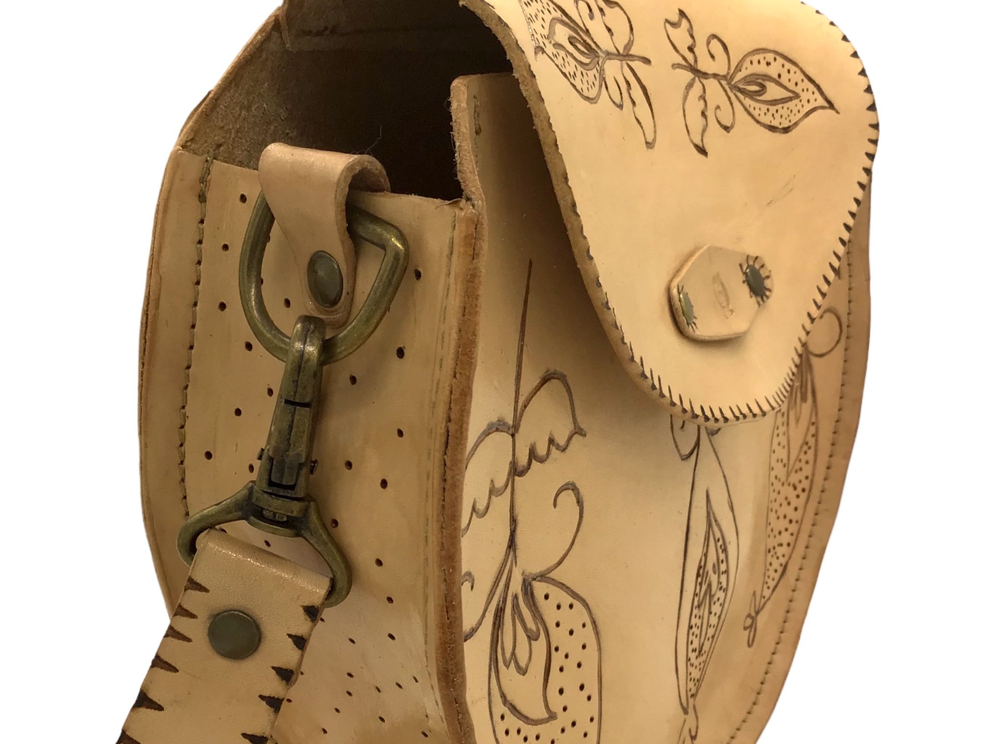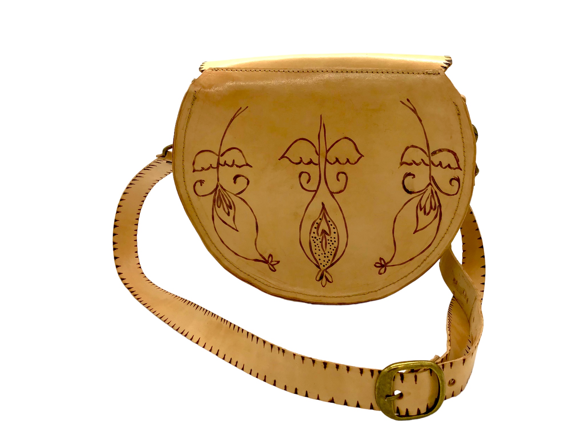 Por el lateral lleva puntos y en ambas caras se decora el bolso con flores pirograbadas con calor dandole un tono marrón quemado al dibujo y una suave relive en su trazo.