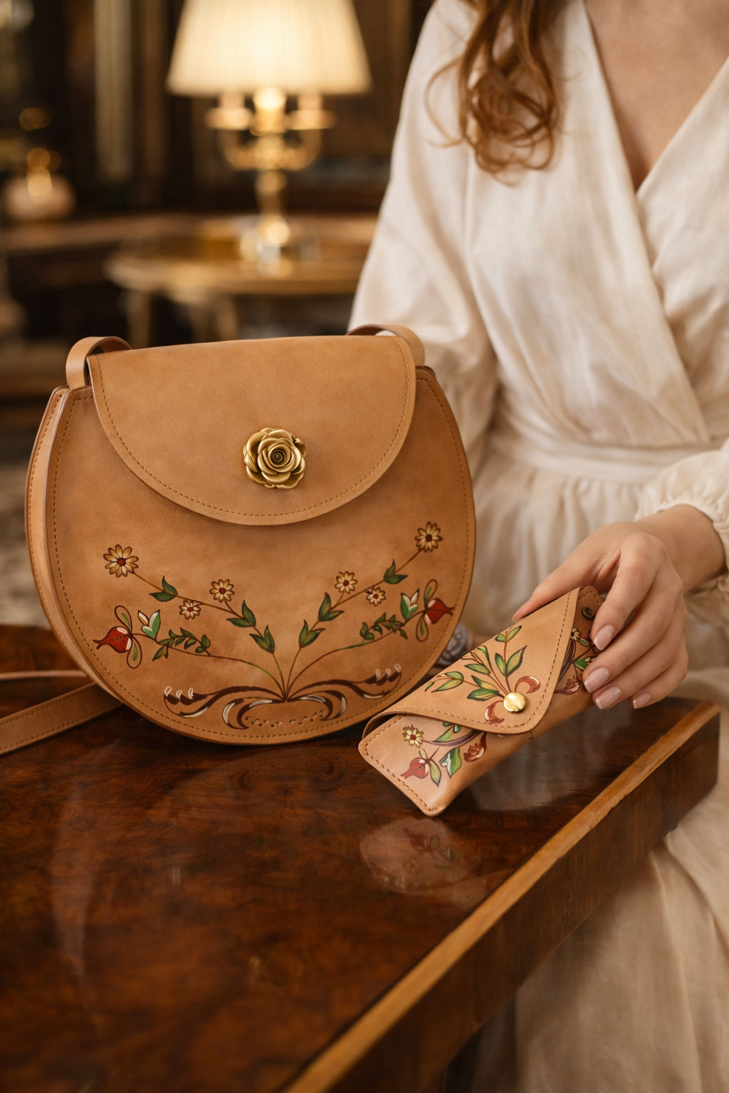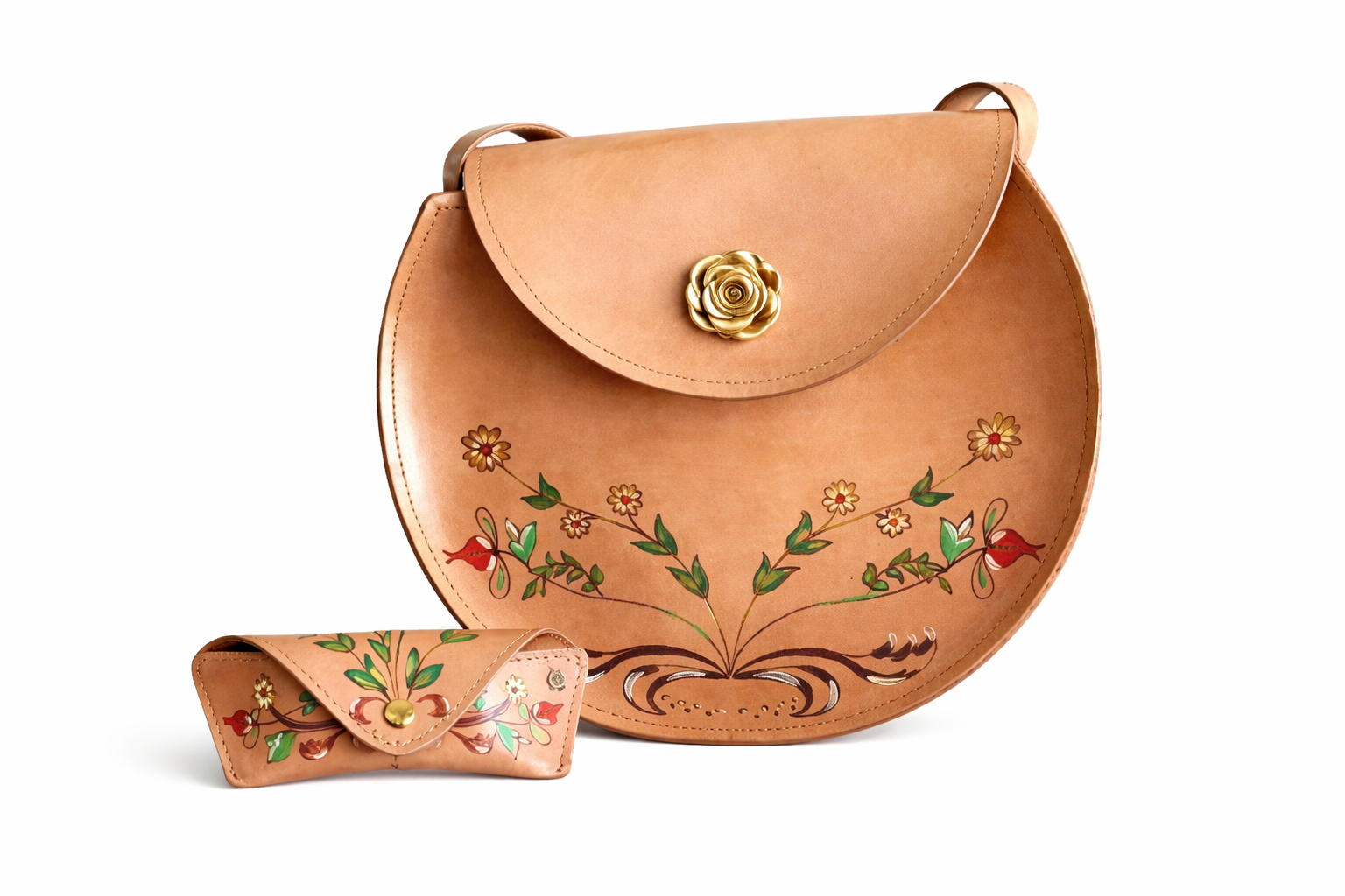 El diseño del  Bolso de cuero Pendientes de la Reina está pirograbado y pintado a mano, con motivos primaverales inspirados en las flores del Aster y los Pendientes de la Reina, que aportan frescura, armonía y un carácter delicado a la pieza.