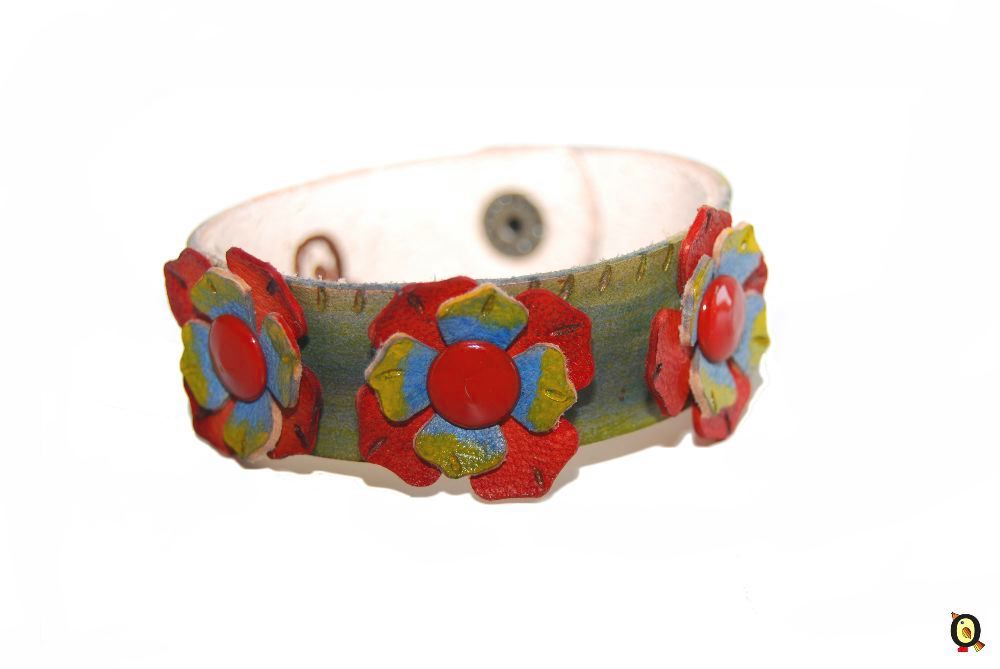 El brazalete es de cuero y está cortado y pintado de forma artesanal.