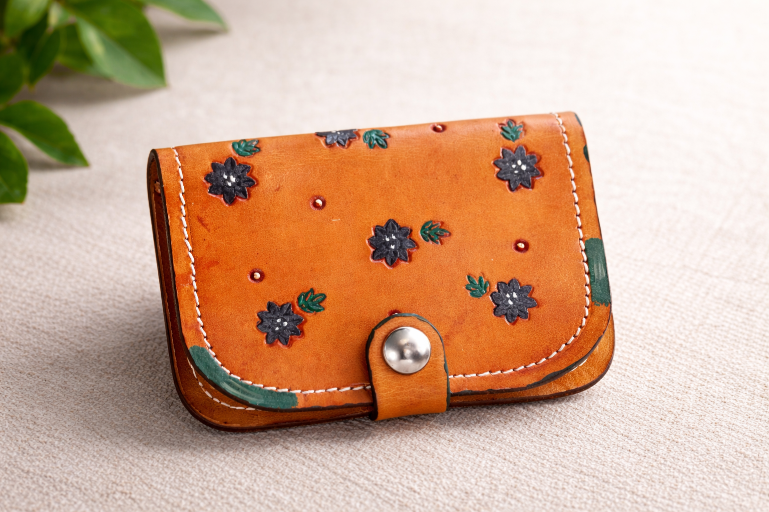 La Cartera de cuero Flores al Atardecer realizada de forma artesanal en cuero de vaca de curtición vegetal, teñida cuidadosamente en un tono naranja cálido que realza la belleza natural del material.