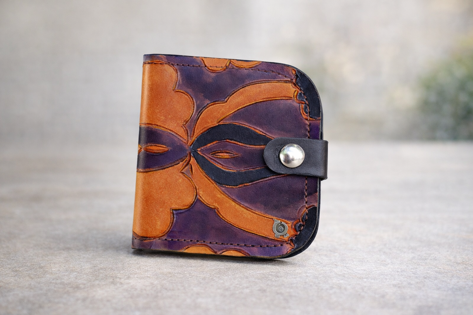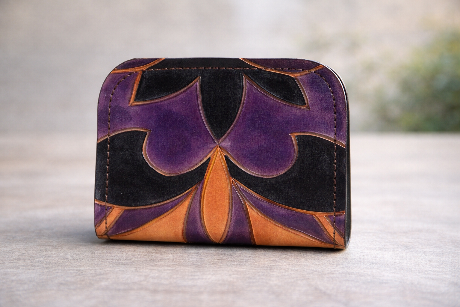 La Cartera Pétalos al Atardecer tras ser pirograbada, la pieza se tiñe a mano con anilinas, combinando tonos violetas, negros y naranjas, que aportan profundidad, contraste y un carácter muy personal. El resultado es una cartera con un diseño intenso y envolvente, donde cada línea y cada color dialogan con la textura natural del cuero.