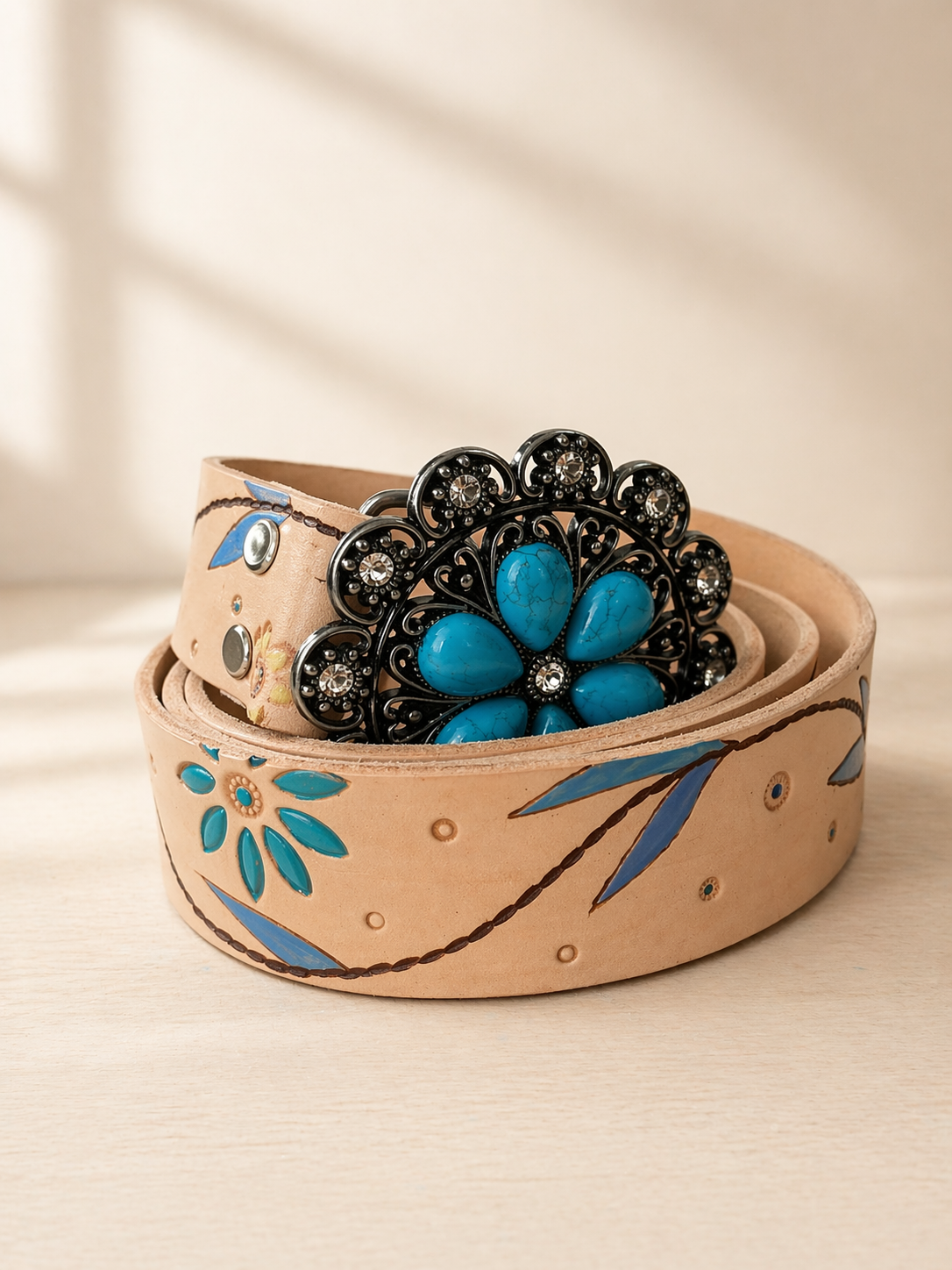 Este cinturón artesanal de piel desprende frescura y delicadeza, con un diseño que evoca la belleza natural de las flores en plena luz. Sobre una base en tono natural, los motivos florales y hojas en azul turquesa están cuidadosamente pintados a mano, acompañados de pequeños detalles grabados que aportan textura y profundidad.