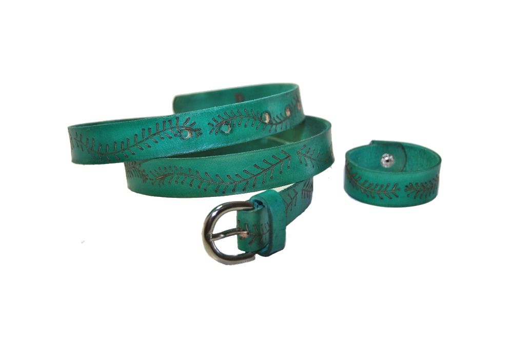 El cinturón de cuero es cortado y entablado a la hebilla de forma artesanal. Su decoración son motivos están pintados a mano.