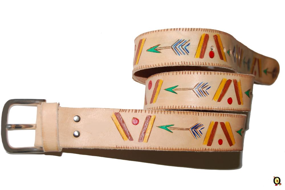 El cinturón cortado y entablado a la hebilla de forma artesanal. Su decoración son motivos están dibujados y pintados a mano.
