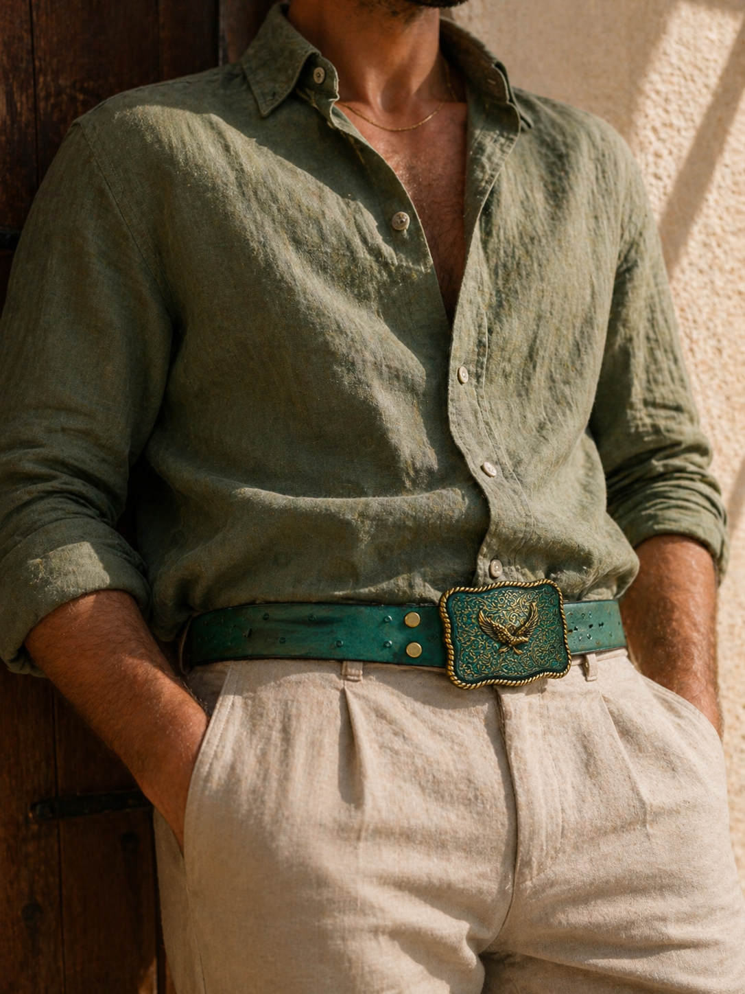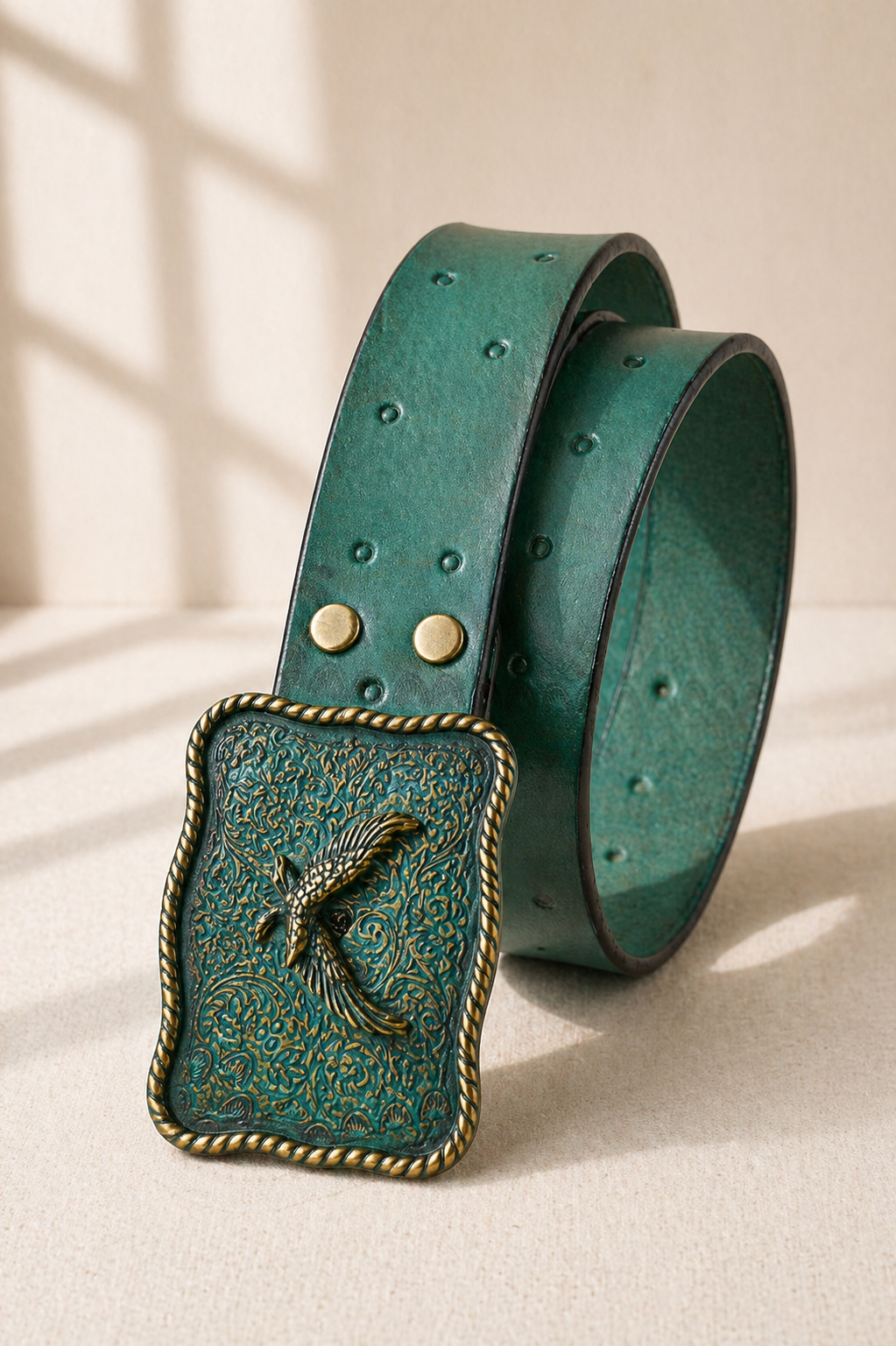 Este cinturón artesanal de piel recoge la esencia de la tierra y la transforma en una pieza elegante y con carácter. Su tono verde profundo, con matices irregulares, aporta una sensación orgánica y auténtica, mientras los pequeños detalles sutilmente trabajados sobre la piel refuerzan su personalidad única.