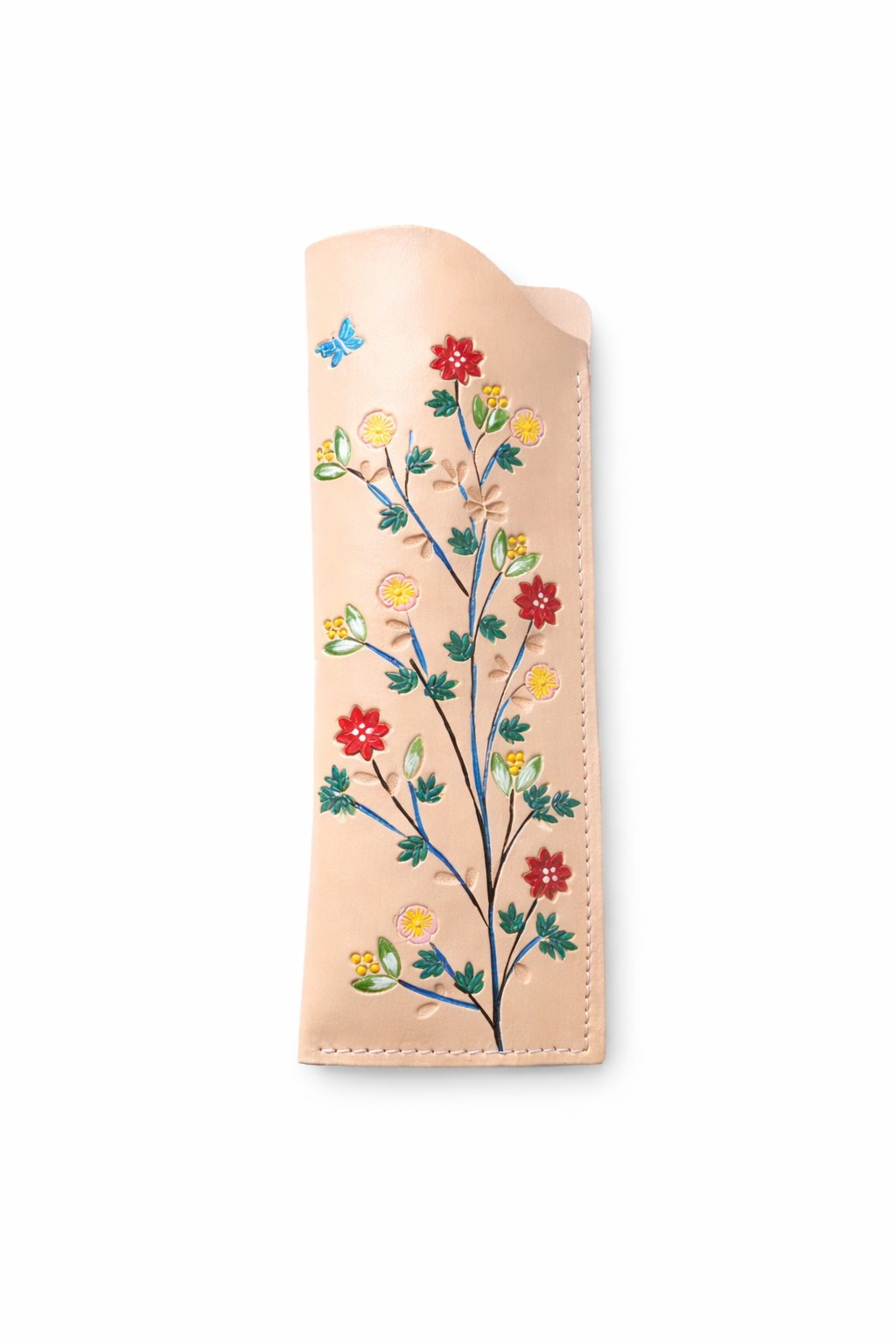 El diseño floral se crea mediante la técnica tradicional del repujado, dando relieve al cuero y aportando textura y profundidad a cada motivo. Posteriormente, se decora a mano con pinturas especiales para cuero, aplicadas cuidadosamente para realzar cada detalle y garantizar un acabado duradero.