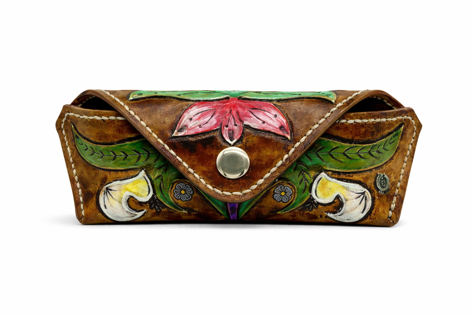 La Funda de Gafas Flor de Lis una vez repujada, la pieza se tiñe con pátina negra, que aporta profundidad al cuero y realza cada detalle del dibujo. Posteriormente, se pinta a mano en suaves tonos pastel —amarillo, verde, azul— creando un delicado juego de color que recuerda a un pequeño arcoíris, haciendo que cada funda sea única e irrepetible.