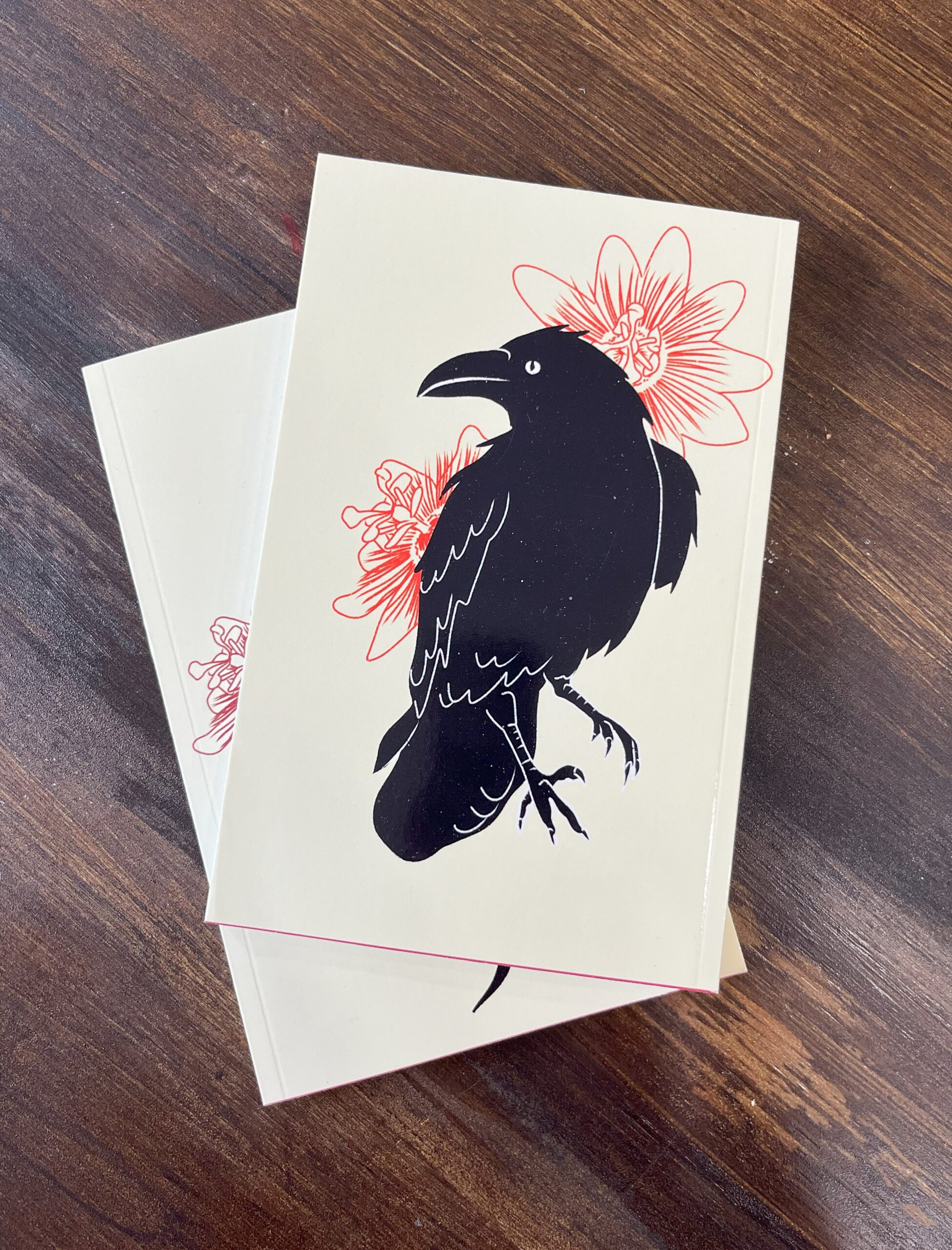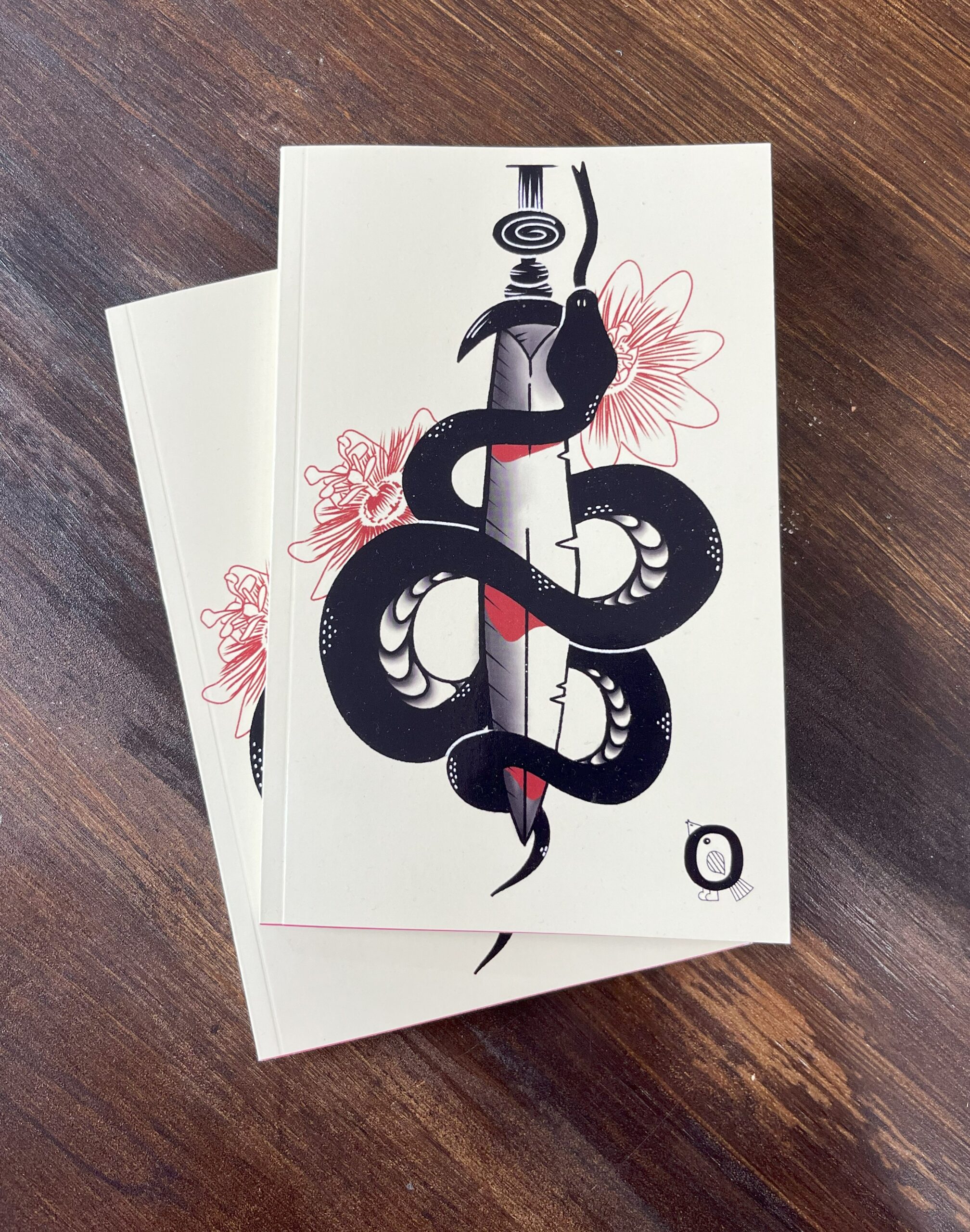 La libreta Sombra y Flor fusiona arte, simbolismo y funcionalidad en un diseño de doble cara que no pasa desapercibido. En la portada, un cuervo negro sobre una flor de la pasión representa la inteligencia, el misterio y la observación silenciosa. Al darle la vuelta, una serpiente se enrosca alrededor de una daga, evocando transformación, poder y protección.