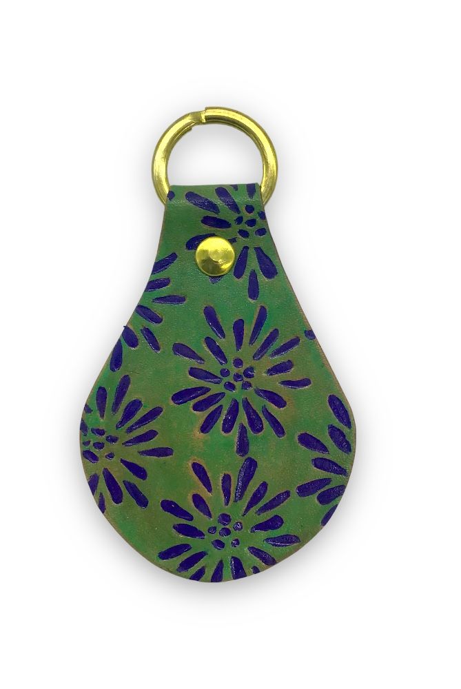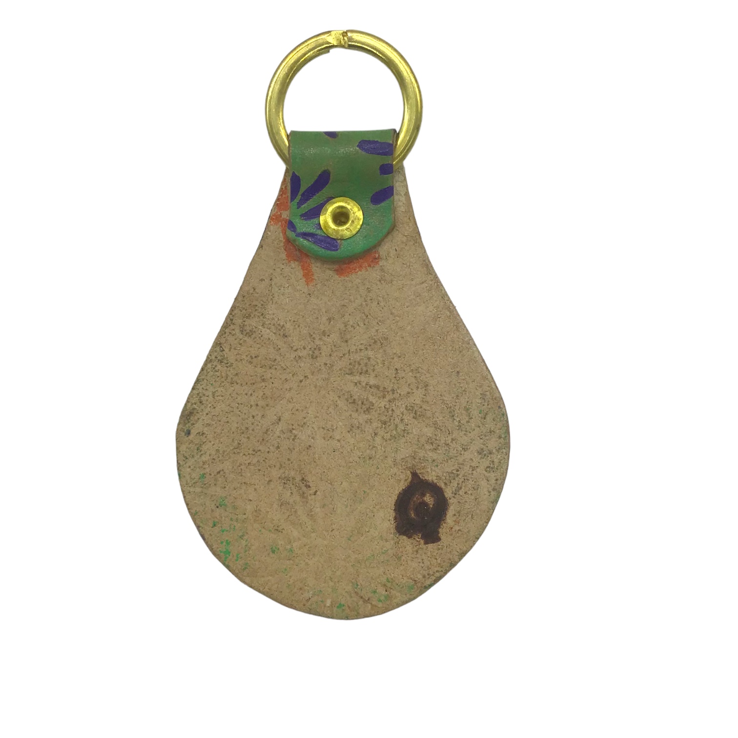 Llavero en cuero con anilla y remache en dorado, pintado a mano en verde con destellos azules.