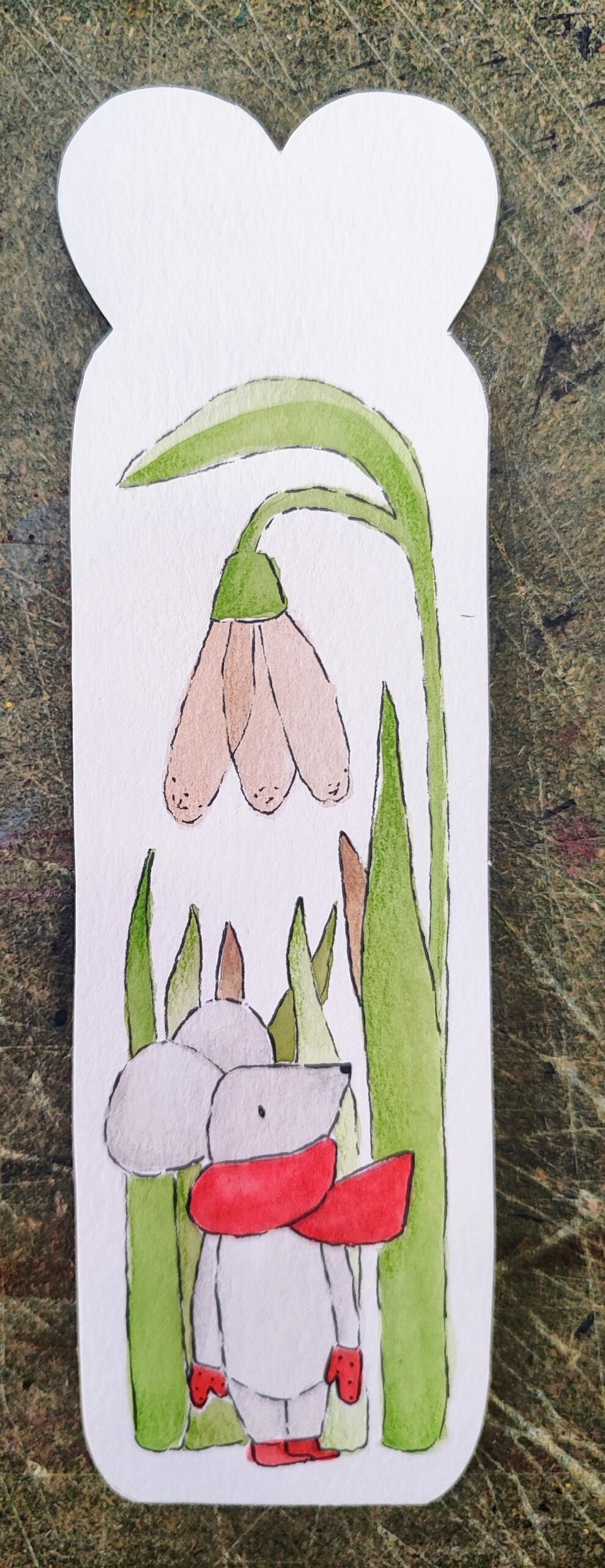 Marcapáginas Bajo la campanilla, artesanal troquelado en papel de acuarela, pintado a mano, con ilustración original de Pajarico.