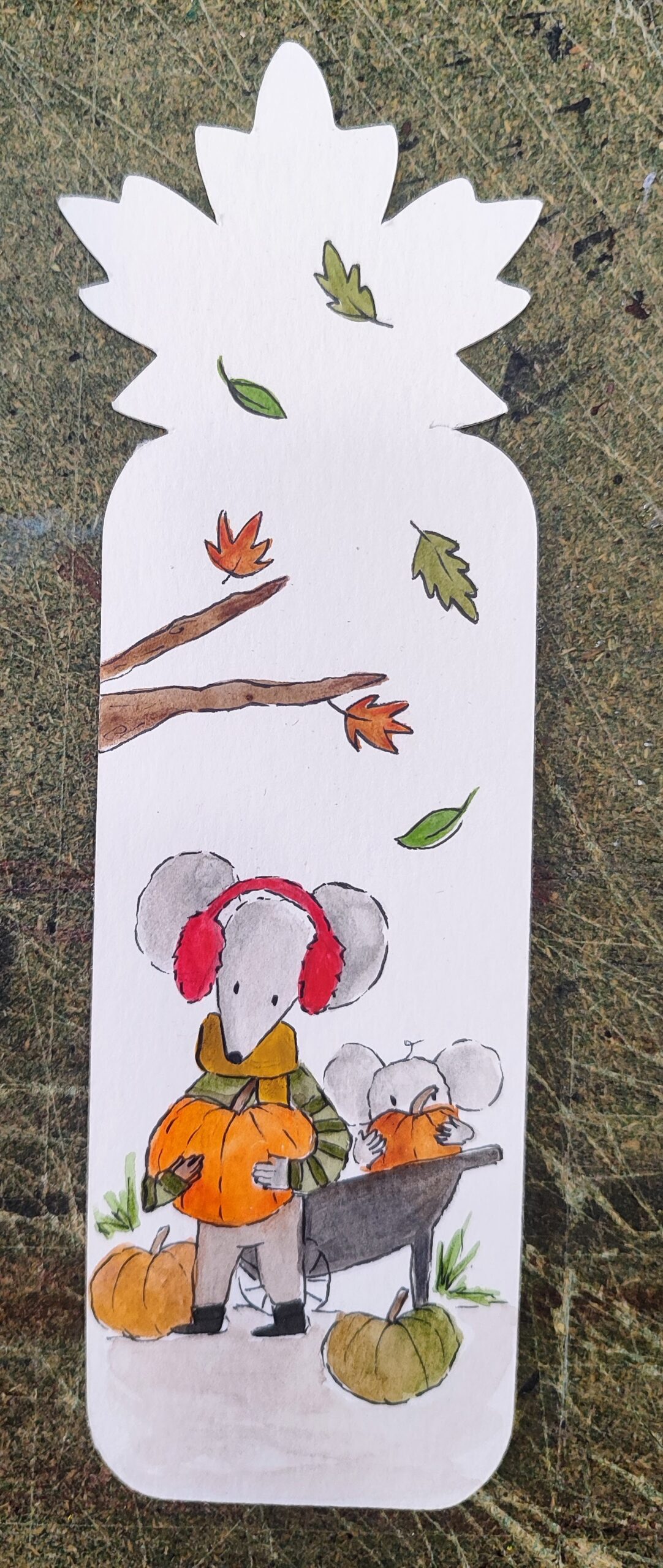 Marcapáginas Cosecha de Otoño, artesanal troquelado en papel de acuarela, pintado a mano con ilustración original Pajarico.