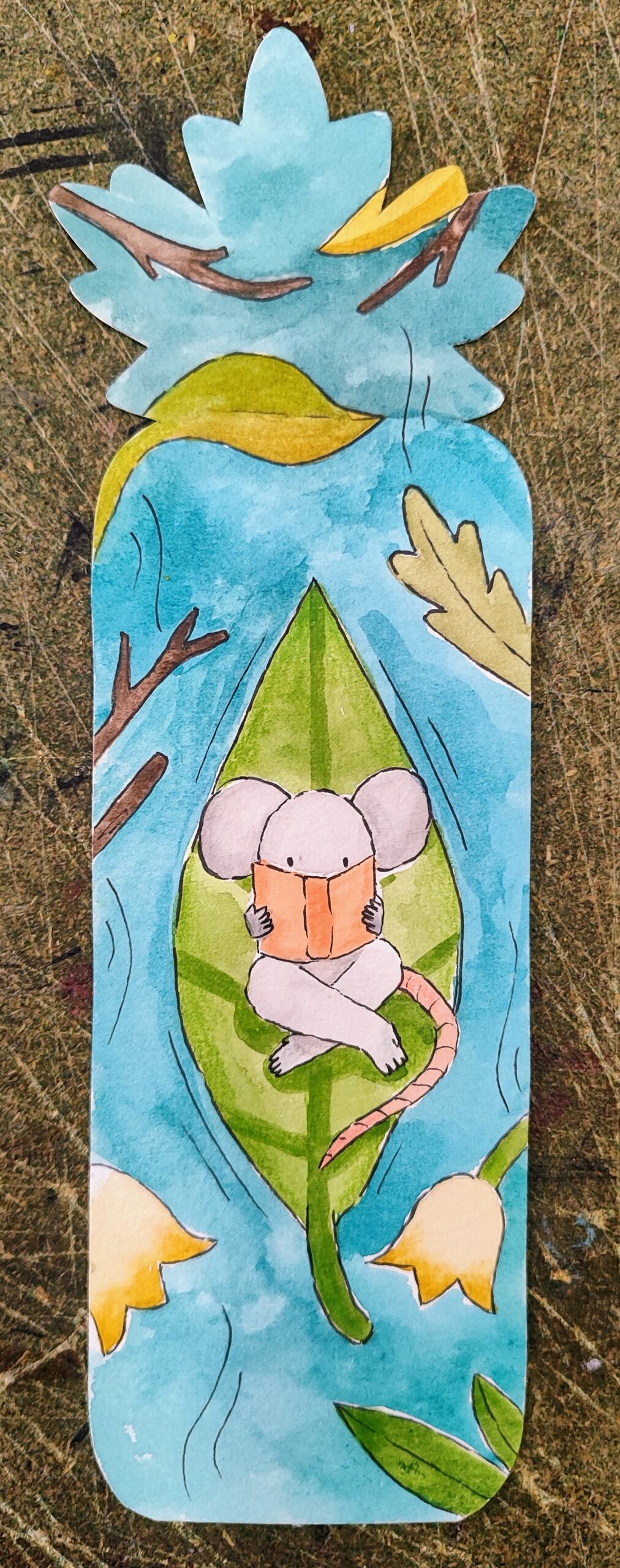 Marcapáginas Ratoncito Lector, troquelado en papel de acuarela, pintado a mano uno a uno, con un diseño original de Pajarico.