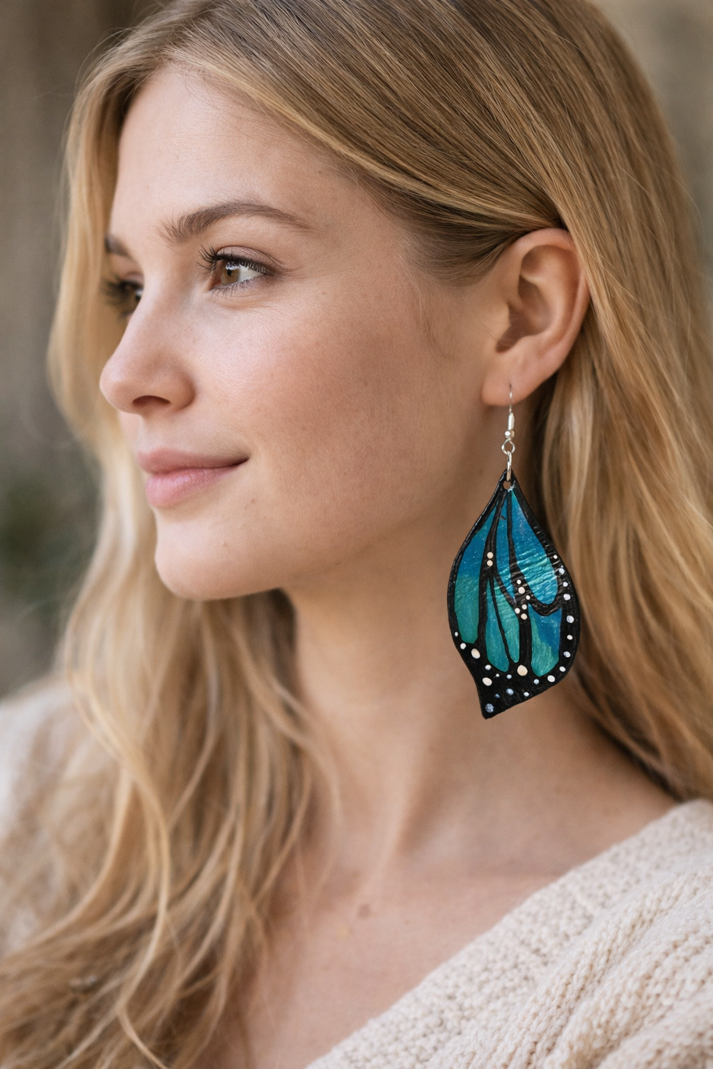 Pendientes artesanales de cuero inspirados en la delicadeza y la belleza de las alas de mariposa. Cada pieza está pintada a mano, con un juego de azules profundos y detalles en negro que realzan su forma orgánica y única.