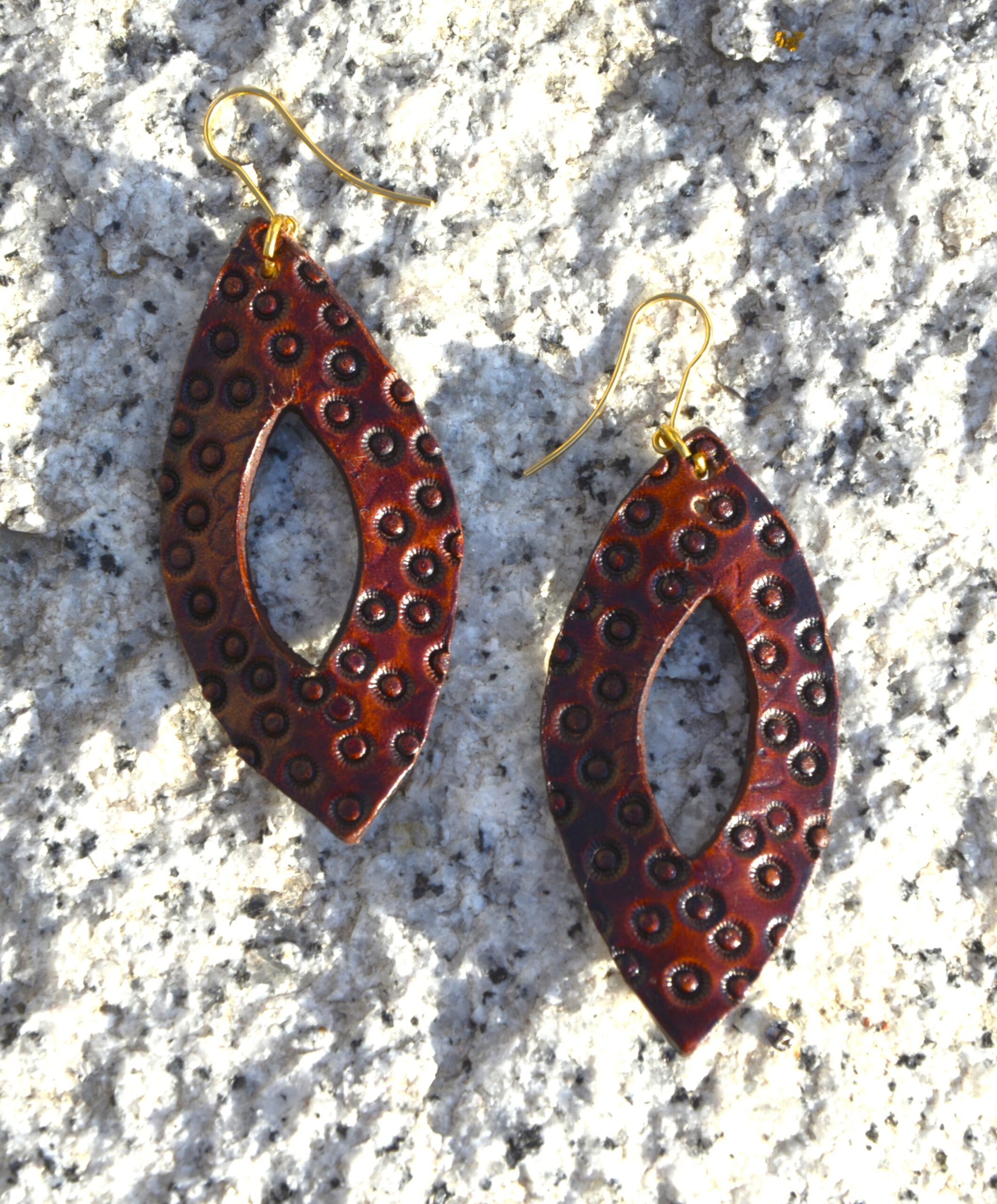 Pendientes Otoño artesanales repujados a mano en cuero natural, tintados en un cálido tono marrón que realza la textura y el relieve del diseño. Su forma ligera y elegante de los Pendientes Otoño se completa con un enganche en tono dorado que aporta un toque luminoso y sofisticado.