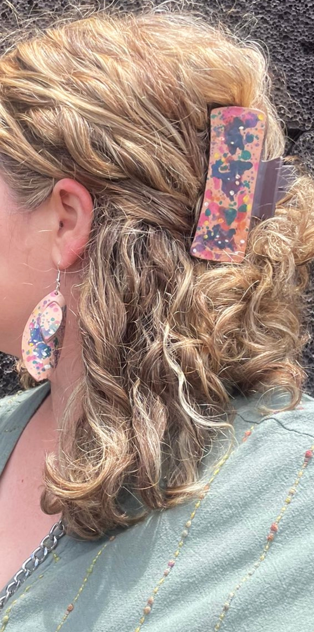 Esta pinza de pelo está decorada a mano sobre piel natural con un diseño de salpicaduras multicolor que la hace única. Su estilo moderno y artesanal la convierte en el complemento perfecto para dar un toque creativo a cualquier look.